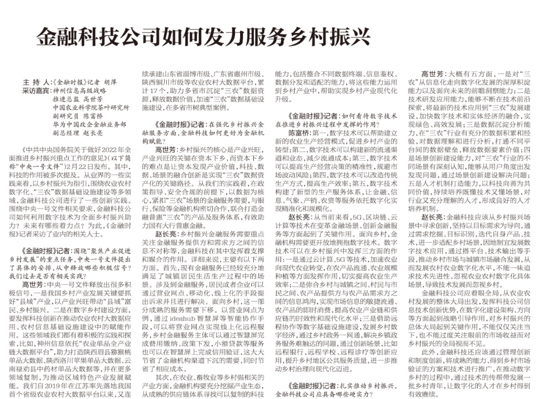 《金融时报》记者:扎实推动乡村振兴,金融科技公司应具备哪些硬实力?