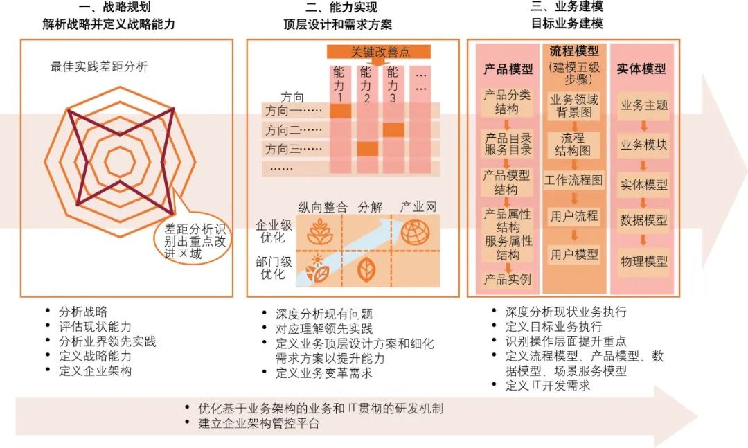 企业级架构规划通常包括解析战略规划、业务顶层设计和专项领域的业务建模三大关键步骤,以推动企业业务价值的快速释放(见图3)。