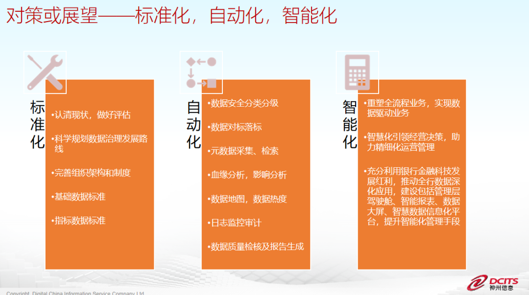对于广大中小银行未来的数据治理工作开展,可以参考从“标准化”到“自动化”,再到“智能化”的路径逐步进行。