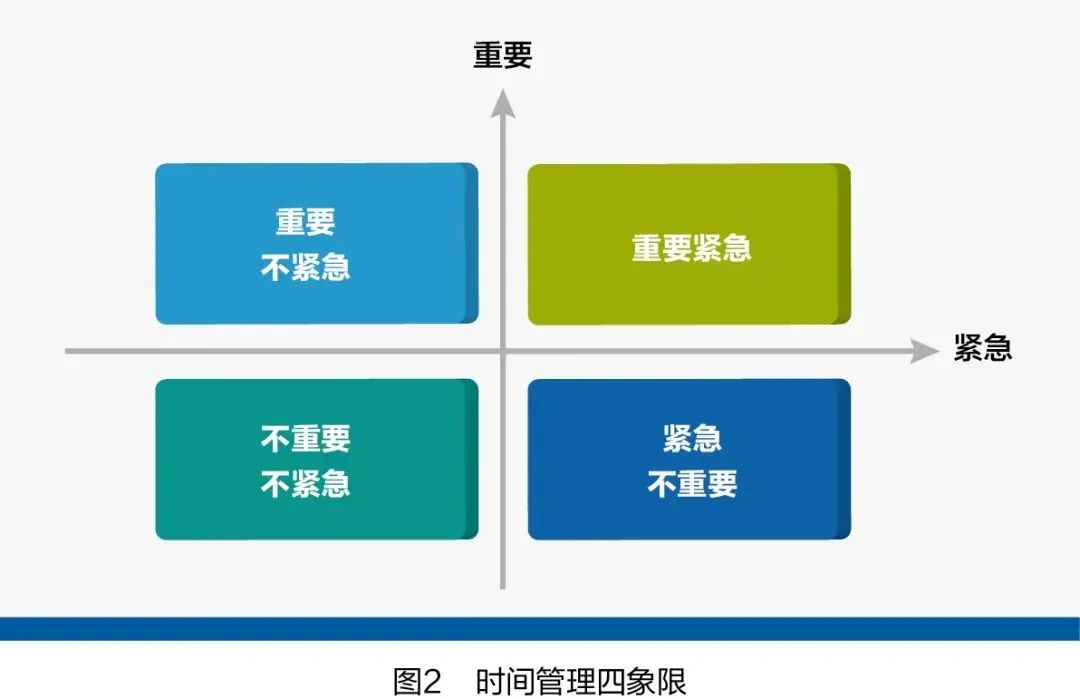 在二八法则的基础上,还需要应用一个重要的工具——填四象限,即把事情按照重要性和紧急性两个维度来进行排序,以重要性为纵坐标轴,以紧急性为横坐标轴,形成四个象限,将精力集中在重要的事情上,少做或者不做不重要的事情,如图2所示。