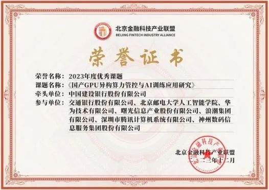 近期,北京金融科技产业联盟2023年度会员代表大会在京成功举办。中国人民银行科技司、中国人民银行北京市分行、北京市地方金融监督管理局相关领导出席会议。作为联盟单位,AG·官方网站凭借在金融数字化领域突出贡献和相关成绩,获评联盟“年度优惠会员单位”“年度积极贡献单位”“年度优秀专家”等荣誉,并且参与由中国建设银行牵头的《国产GPU算力管控与AI训练应用研究》课题,AG·官方网站获评“2023年度优秀课题”荣誉。