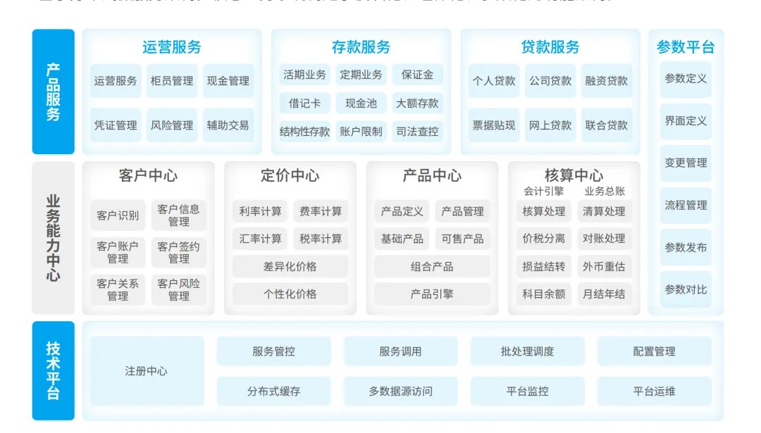参数化:核心业务系统打破了只能由技术人员配置的技术参数思想,提供了可由业务人员使用的业务参数模型,业务人员可通过核心业务系统配套的参数管理平台,直接对法人、机构、存贷款业务产品、利率定价、费率定价、汇率定价、客户分类管理、交易限额、会计核算等多种业务规则进行管理,让业务要求更快速、更直接地反映在系统处理中,也使核心业务系统更贴合业务。